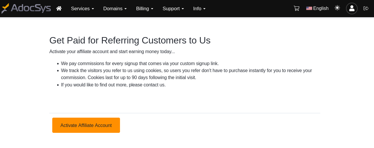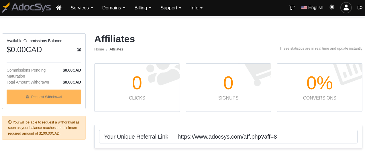 Once your account is created, you can go to the “Billing” menu and click on “Affiliates”.